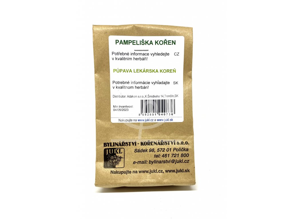 Použití: O léčivých účincích pampelišky se vědělo již v antice, kdy se mléko z pampelišky kapalo na pihy a využívalo při zánětech očí a při celkové ochablosti! Pampeliška je "nabitá" velmi prospěšnými látkami. Například inulínu, který perfektně vyživuje mikroflóru tlustého střeva je na podzim v pampelišce velmi mnoho. Tím vlastně pampeliška představuje velmi účinné probiotikum, které tím, že dostane Vaše tlusté střevo do optimální formy zároveň nepřímo posílí Vaši imunitu, upravuje hladinu cukru v krvi, snižuje vysoký tlak a působí proti střevním mikrozánětům a nádorovým onemocněním tlustého střeva. Zjara pak pampeliška představuje "vitamínovou bombu". V bylinkářství se využívá hojně též vyvážená kombinace tříslovin, hořčin a aminokyselin. S úspěchem ji doporučujeme při problémech s játry a žlučníkem, jako podporu při léčbě žloutenky, močového měchýře, ledvin, zažívání, při revmatismu a bolestech hlavy v důsledku intoxikace.Balení: papírový sáček 50 g netto