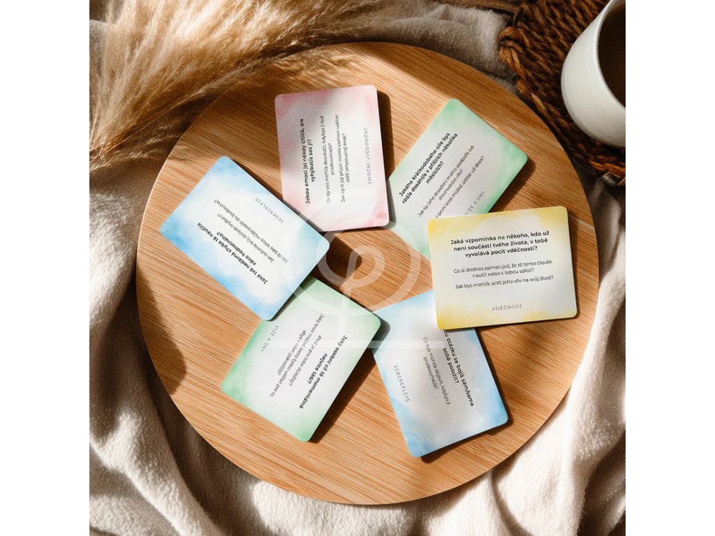 Naše Karty sebereflexe jsme vytvořili tak, aby tě v takových chvílích provázely. Ať už ti přijde, že se točíš v kruzích, hledáš hlubší propojení s druhými nebo si přeješ lépe poznat sám nebo sama sebe, tato sada karet je skvělým nástrojem, který ti pomůže se zastavit, zamyslet se a najít odpovědi uvnitř.