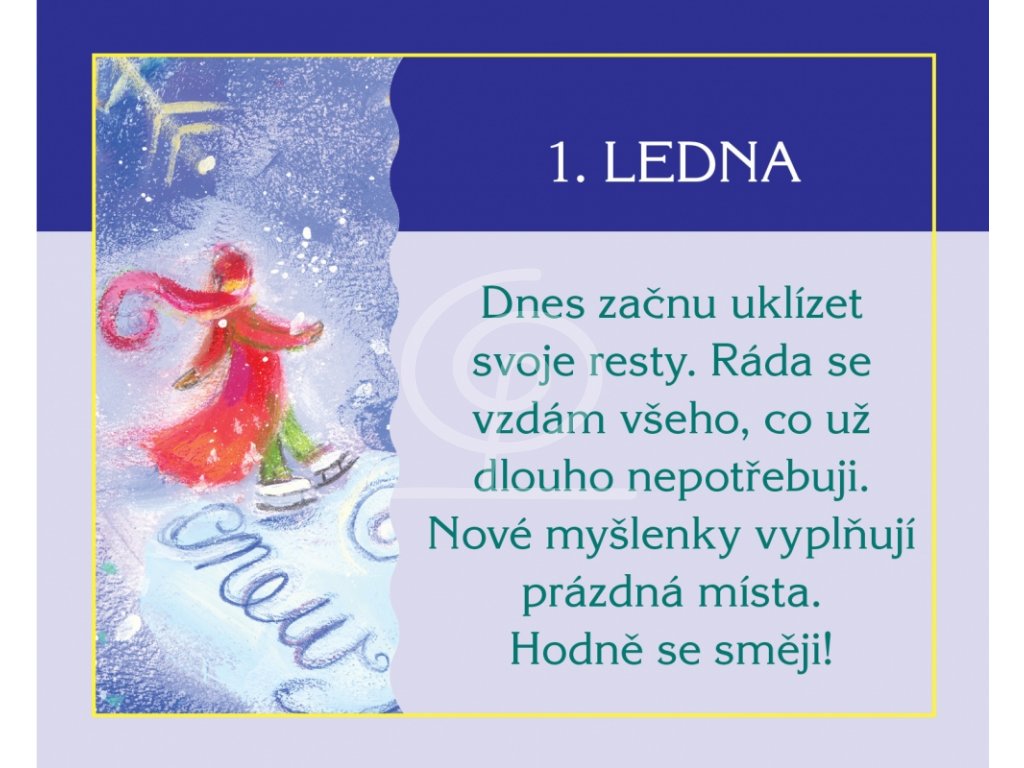 ANOTACELouise L. Hay, světově uznávaná autorka knihy Miluj svůj život, pro vás vytvořila kalendář se silnými afirmacemi, který můžete používat každý den, rok co rok. Afirmace jsou zaměřeny na základní oblasti našeho života - milostné vztahy, zdraví, odpuštění, tvořivost, zvládání stresu, bohatství, úspěch a spokojenost v zaměstnání. Tyto afirmace vám dodají vnitřní sílu a lehkost při prožívání každodenních situací. Navíc jsou doplněny půvabnými ilustracemi malířky Joan Perrin-Falquet, která často s Louise L. Hay a jinými duchovními učiteli spolupracuje. Její obrázky jsou plné životní energie, která je pro nás tolik potřebná.