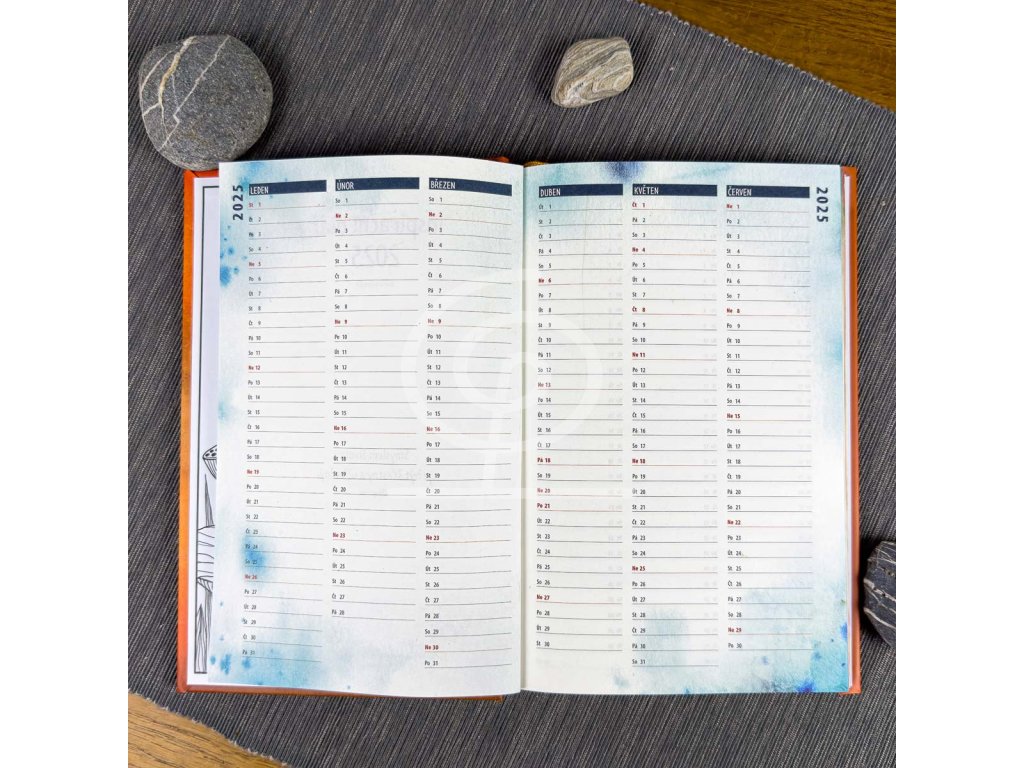 Na každé dvoustraně přehledné kalendárium aktuálního měsíce a číslo týdne.