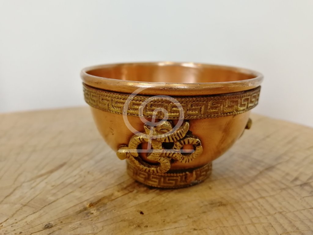 Tibetská mosazná miska se zlatými symboly, sloužící jako kadidelnice, velikost malá.