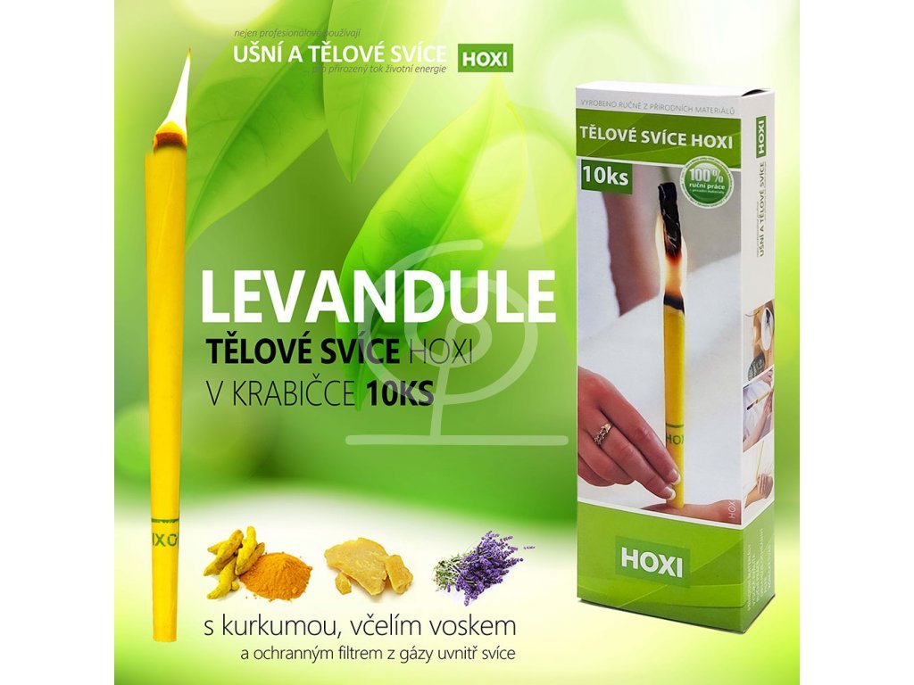 ělové svíce HOXI s levandulí jsou vyrobeny ručně ze 100% bavlněného plátna, včelího vosku a protizánětlivé kurkumy. Tělové svíce HOXI s levandulí jsou kónického tvaru s optimalizovanou délkou pro co nejlepší účinnost. Každá tělová svíce HOXI je opatřena ochranným filtrem z gázy. Papírová krabička tělové svíce HOXI chrání jak před světlem, tak i před poškozením, lépe je můžete převážet a dobře se skladují. Krabička je vyrobena z recyklovaného papíru, abychom alespoň trochu podpořili ochranu životního prostředí :).Nej