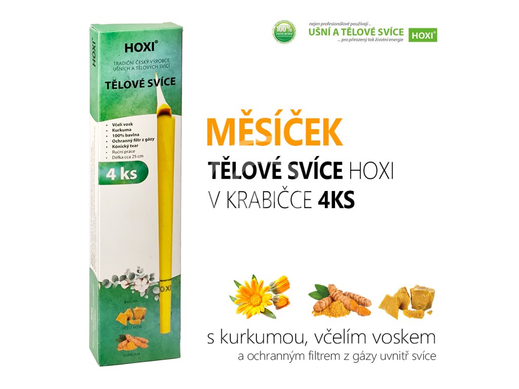 ělové svíce HOXI s měsíčkem jsou vyrobeny ručně ze 100% bavlněného plátna, včelího vosku a protizánětlivé kurkumy. Tělové svíce HOXI s měsíčkem jsou kónického tvaru s optimalizovanou délkou pro co nejlepší účinnost. Každá tělová svíce HOXI je opatřena ochranným filtrem z gázy. Papírová krabička tělové svíce HOXI chrání jak před světlem, tak i před poškozením, lépe je můžete převážet a dobře se skladují. Krabička je vyrobena z recyklovaného papíru, abychom alespoň trochu podpořili ochranu životního prostředí :).Nej
