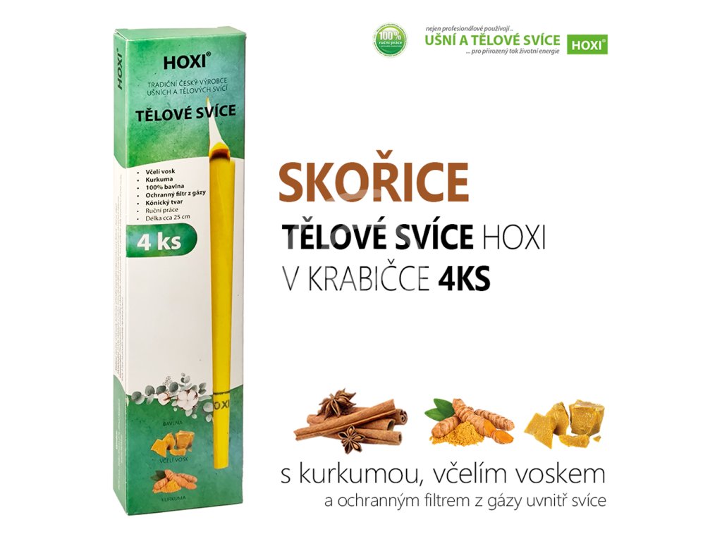 ělové svíce HOXI se skořicí jsou vyrobeny ručně ze 100% bavlněného plátna, včelího vosku a protizánětlivé kurkumy. Tělové svíce HOXI se skořicí jsou kónického tvaru s optimalizovanou délkou pro co nejlepší účinnost. Každá tělová svíce HOXI je opatřena ochranným filtrem z gázy. Papírová krabička tělové svíce HOXI chrání jak před světlem, tak i před poškozením, lépe je můžete převážet a dobře se skladují. Krabička je vyrobena z recyklovaného papíru, abychom alespoň trochu podpořili ochranu životního prostředí :).Nej