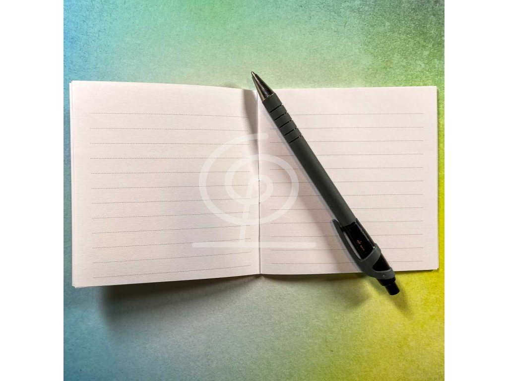Zápisníček má 18 listů (36 stran) linkovaného papíru, rozteč linek je 6 mm a mají světle šedou barvu. Obálka je z matného, silnějšího (200 g), křídového papíru.