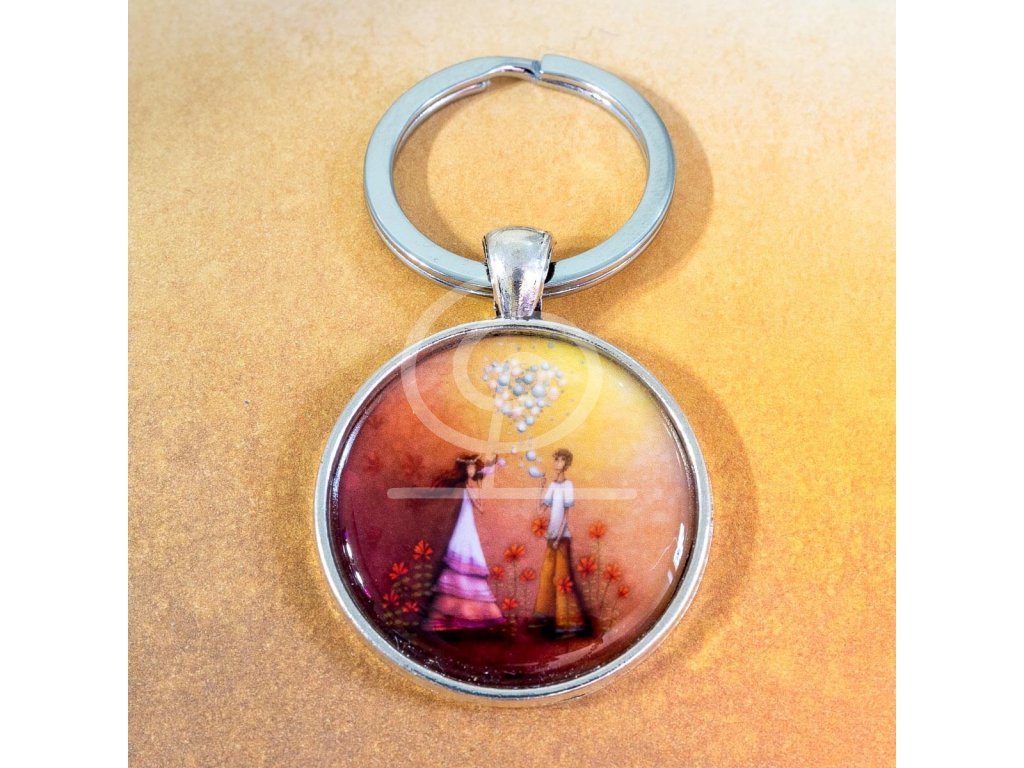 Přívěsek na klíče tvořený kovovým lůžkem průměru 32 mm a čočkou z křišťálové pryskyřice. Čočka s obrázkem má průměr 30 mm. Přívěsek je zavěšený na plochém kroužku na klíče.
